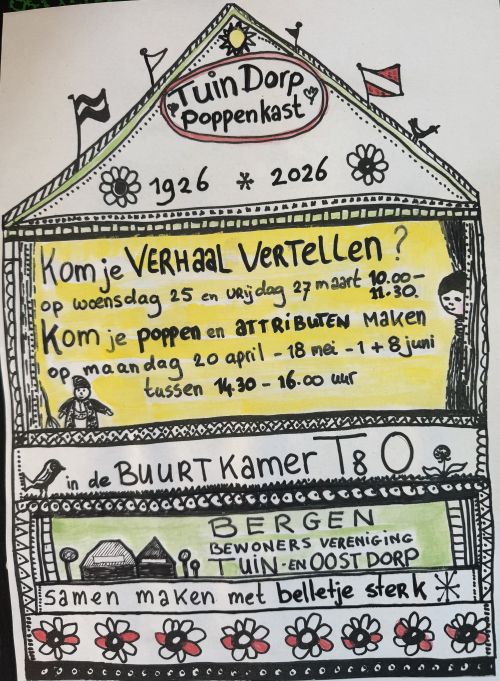 Er komt een heuse Tuindorp-poppenkast anno 1926! Om de poppenkast leven in te blazen zijn wij op zoek naar grappige, herkenbare en levendige verhalen en anekdotes uit Tuindorp uit de afgelopen 100 jaar. Iedereen is van harte uitgenodigd om op een van de voorbereidingsmomenten op woensdagochtend 25 maart en vrijdagochtend 27 maart verhalen te delen en koffie of thee te drinken. Van 10.00-11.30 uur in de Buurtkamer in het T&O-gebouw.